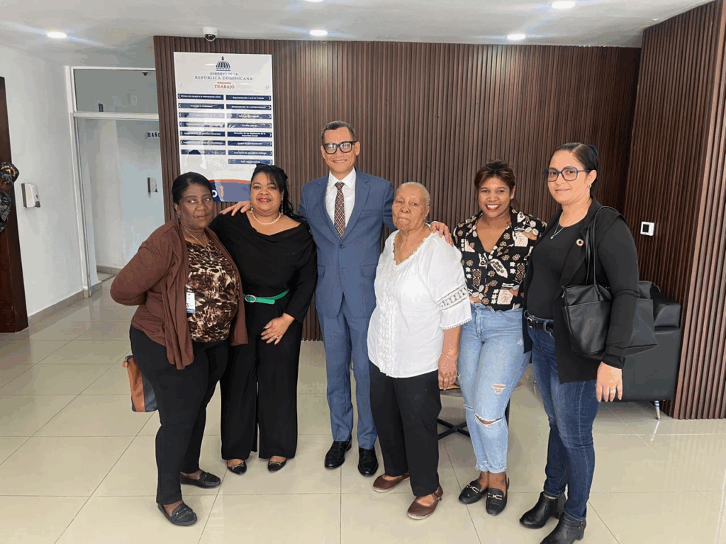 Photo taken at the Ministry of Labor on April 8, 2025. From left to right: Ruth Díaz, president of FUNAMUTRA; María Cornelia Valdez, general secretary of UNFETRAH-FENAMUTRA; Eddy Olivares, Minister of Labor; Victoria García, president of the Association of Domestic Workers ATH-CNUS; Marubeny Pérez, General Secretary of SINTRADOMES-CASC, and Elena Pérez, General Secretary of the Domestic Workers’ Association.