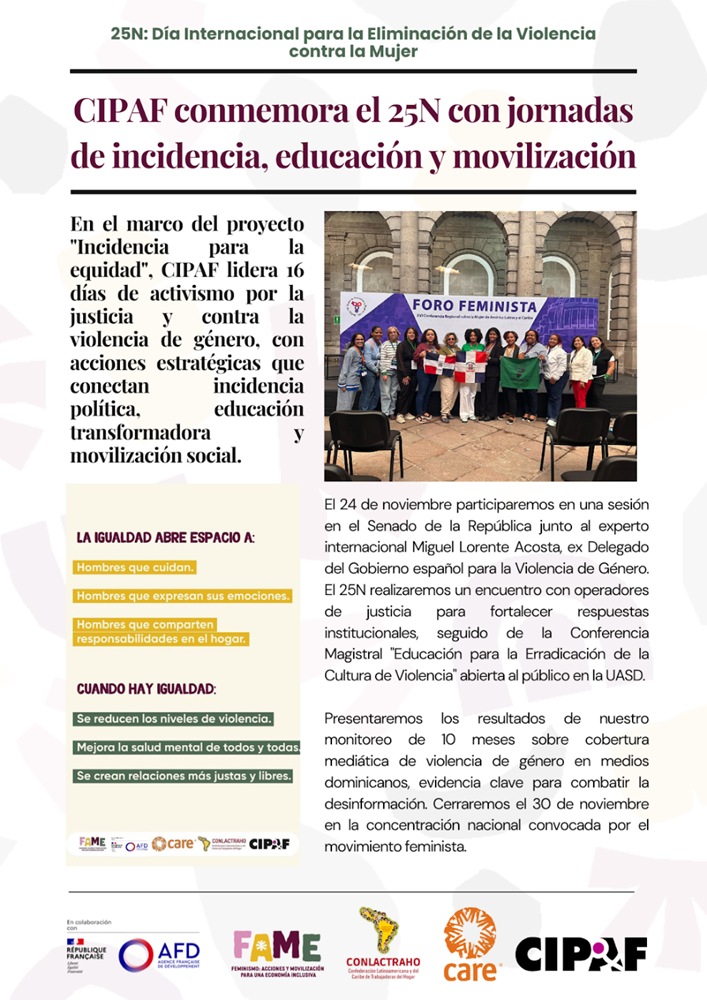 En el marco del proyecto «Abogacía por la equidad», el CIPAF lleva a cabo 16 días de activismo por la justicia y contra la violencia de género, con acciones estratégicas que vinculan la incidencia política, la educación transformadora y la movilización social.